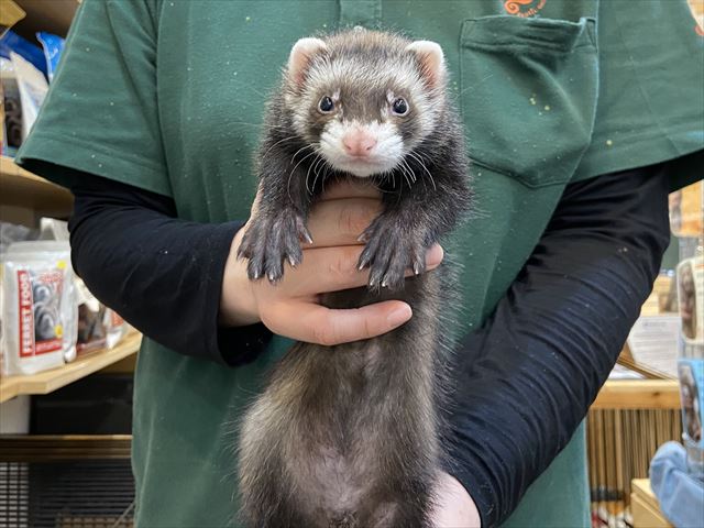 | スタッフコメント | 全体的にしっかり濃いめのセーブルの男の子です(^^)/ しっかりご飯を食べてくれていて、いつもころころとしている姿が可愛いですよ♪ マウンテンビューフェレットらしくマイペースな子で、動画では遊ぶ時もゆるゆると遊んでくれました(´▽`*)この子が気になる方は是非立川店までお問い合わせくださいね! |