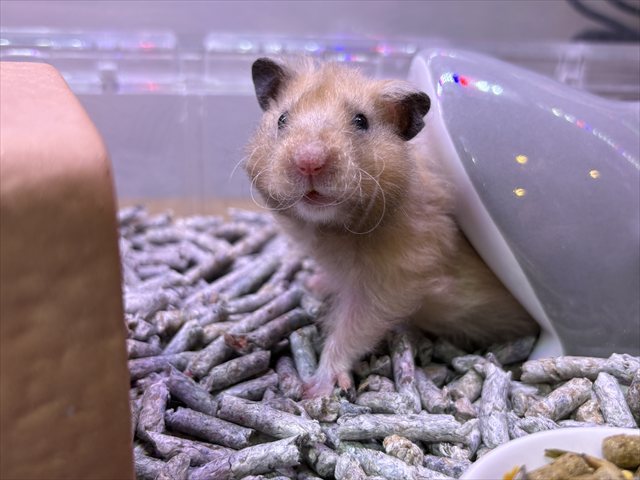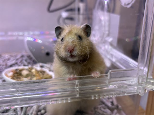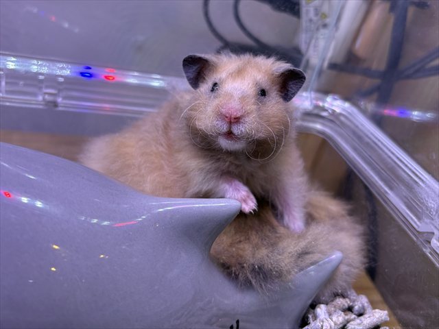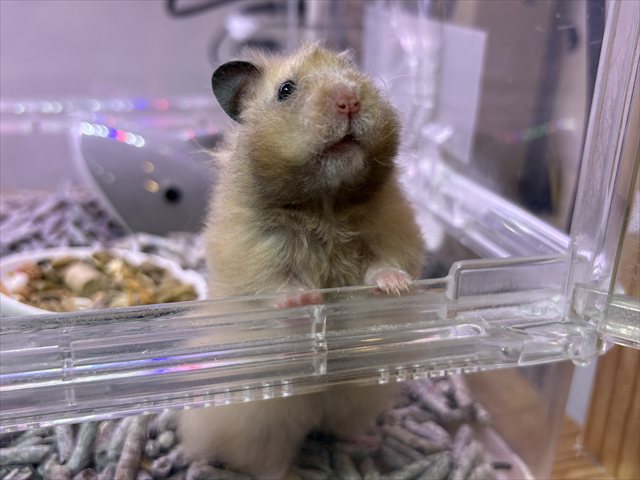 | 特徴&性格 | くるくるの巻き毛とおヒゲが特徴のシリアンハムスターくん! 全体的にこんがりきつね色で、毛先にほんのり黒っぽいお色が 混ざっているおしゃれカラーの男の子です(*^▽^*) まだあまり人に慣れていないのでおっかなびっくりではありますが ケージを開けるとゆっくり少しずつ近寄ってきてくれます( *´艸`) とっても珍しい種類のハムスターちゃんなので、 この子が気になる方はぜひお店に会いにいらしてくださいね♬ |
