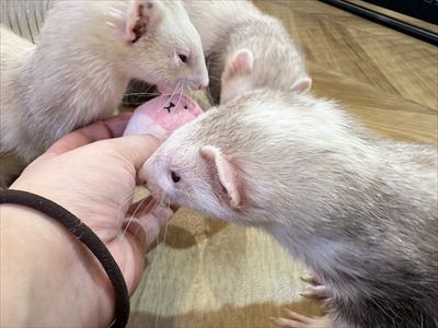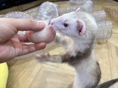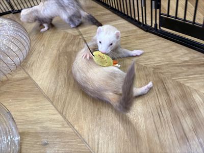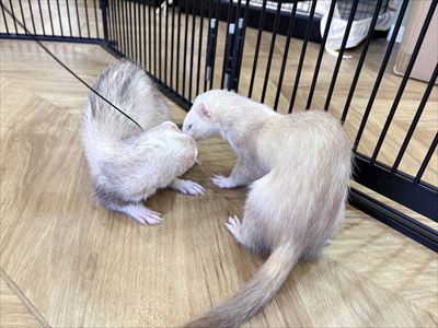 ちっぷちゃんが気に入ったようで、他の2人がいなくなった後も離れずクンクン、、ガブっ!噛みどころを見つけたのか咥えてサークルの隅っこへ運び屋🚶
